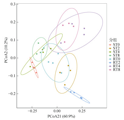 基于主坐标分析结果显示(图 3),主成分1和主成分2对样品差异性的贡献值累计为71.1%。总体看,RT0、RT4和RT8处理根际土壤真菌群落主要分布PCoA2的正值区域,而ST0、ST2、RT2主要分布在PCoA1和PCoA2的负值区域,说明连作下烟草根腐病抗(感)品种根际土壤真菌物种组成存在明显差异。进一步Anosim检验结果显示连作条件下烟草根腐病不同抗性品种根际土壤真菌群落结构较离散(P=0.001)。