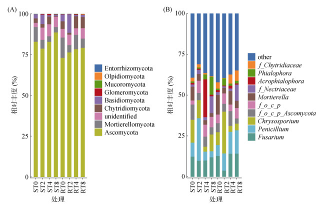 图 4B显示了相对丰度前10位的优势菌属,分别为镰刀菌属(Fusarium)、青霉菌属(Penicillium)、金孢霉属(Chrysosporium)、f_o_c_p Ascomycota、f_o_c_p、被孢霉属(Mortierella)、f_Nectriaceae、端梗孢属(Acrophialophora)、瓶霉属(Phialophora)和f_Chytridiaceae。ST2、ST4、ST8处理镰刀菌属相对丰度依次为9.8%、10.1%、12.0%,青霉菌属相对丰度分别为26.1%、5.4% 和3.7%,说明随连作年限的增加,镰刀菌属相对丰度呈增加趋势,青霉菌属相对丰度呈降低趋势。RT2、RT4、RT8处理镰刀菌属相对丰度依次为3.8%、14.1% 和14.2%,青霉菌属有益菌丰度分别为10.6%、13.4% 和14.3%,均呈增加趋势。另外,长期连作(4 a和8 a)下RT4、RT8处理根际土壤真菌f_Chytridiaceaes属相对丰度明显高于ST4和ST8处理。综上,长期连作下,抗病品种根际土壤根腐病原菌丰度及有益菌丰度均高于感病品种。