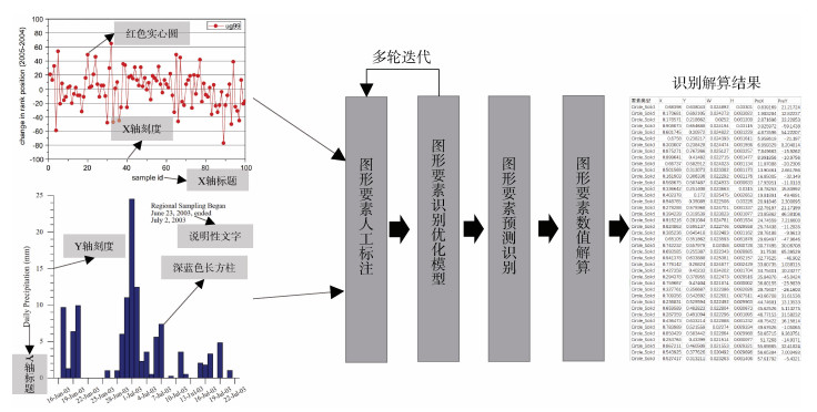 1 研究方法 1.1 基本思路土壤学文献有多种常见图形,如柱状图、条形图、折线图、饼图、散点图、样点分布地图等,以及多个类型组合的复杂图形开展研究,自动化提取多种图形较难实现。作为一个初步技术框架,本文主要针对散点图、柱状图等二维图形。文献图形中包括图形符号、坐标轴标签、坐标轴刻度、说明性文字、公式、图例等多种要素,点、线拐点、柱状要素顶端等关键位置及其表征的数值是研究人员最感兴趣的。因此,识别图形中符号类型及其在图形坐标系中的位置信息,对土壤文献图形的数值提取最为重要。