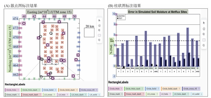 YOLO v8是对COCO (Common objects in context)数据集进行训练的一个基础模型,可以识别人、交通工具、动物、日常用品等80种预训练目标,但缺乏针对文献图形要素的识别能力。因而,需要对土壤学文献散点和柱状图中的要素符号进行系统梳理,并人工标注,形成土壤学文献图形要素基础数据集。图像标注的基本目标是根据视觉内容和可获得的指导信息来确定对应的文本语义描述[26],在综合考虑任务及标注系统便捷性等因素后,使用开源的Label Studio标注软件,对论文图形要素进行人工标注,详细步骤如下。