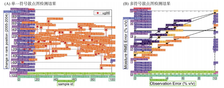 (图中不同颜色矩形框代表识别出的不同图形要素,框旁文字为要素类型及置信度;下同) 图 3 单一符号(A)和多类型符号(B)散点图中图形要素检测结果 Fig. 3 Identification results of elements in scatterplots with single dot (A) and multiple dots (B) |