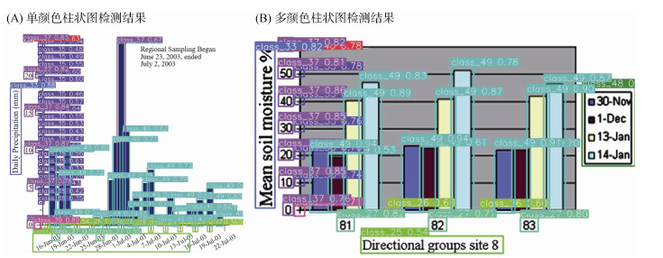 为验证本研究所建模型对单色、多色柱状图的识别效果,分别选取相应的图形进行预测。从图形要素检测结果(图 4)可以发现,大部分柱状要素均可以被本研究所建模型识别,X/Y轴名称、Y轴数值及其对应刻度也能被检出。在单一颜色柱状图中,共有23个柱状要素,模型检出25个,存在2个错误检测(错检率8.70%);在多颜色柱状图中,共有12个柱状要素,模型检出12个,完全检出,检测率100%。这表明在二维柱状图中,训练的图形要素识别模型具有较好的柱状符号检测效果,在柱状要素边界清晰(如不同颜色、分散的柱状图)的图形中检测效果较好,而当柱状要素密集时检测效果相对较差。