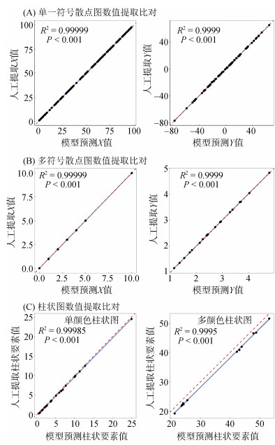 为验证本文技术框架的数值提取结果,利用常用的图形数值提取工具Web Plot Digitizer (https://automeris.io/WebPlotDigitizer/),手工提取图形中数值,将自动解算的图形数值与手工提取结果进行线性拟合分析,并用决定系数(R2)评价两种方法获取数据的一致性。
