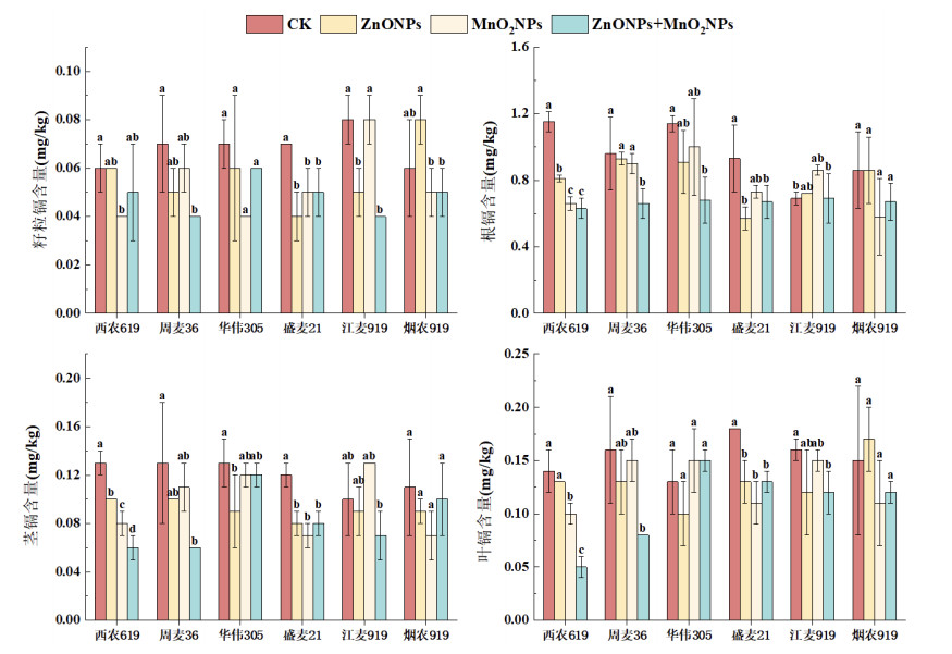 叶面喷施纳米材料对6个小麦品种籽粒、根、茎和叶Cd分布的影响具有显著差异(图 1)。小麦组织各部位Cd含量由高到低的顺序为:根 > 茎 > 叶 > 籽粒。在对照处理组中,6个小麦品种籽粒Cd含量(0.06 ~ 0.08 mg/kg)均低于国际食品法典委员会(CAC)标准[28]和我国《食品安全国家标准食品中污染物限量》(GB 2762—2022)[29]标准规定的0.1 mg/kg。与对照相比,叶面喷施ZnONP分别使西农619、周麦36、华伟305、盛麦21和江麦919的籽粒、茎和叶的Cd含量明显降低8% ~ 25%、19% ~ 25%、10% ~ 30%、27% ~ 40% 和10% ~ 37%,但烟农919根、茎和叶的Cd含量降低效果均不显著;叶面喷施MnO2NP分别使西农619、周麦36、华伟305、盛麦21和烟农919的籽粒、根和茎的Cd含量明显降低35% ~ 42%、7% ~ 16%、8% ~ 38%、21% ~ 45% 和27% ~ 39%;叶面喷施ZnONP+MnO2NP分别使西农619、周麦36、盛麦21、江麦919和烟农919的籽粒、根、茎和叶的Cd含量明显降低23% ~ 62%、31% ~ 51%、26% ~ 37%、1% ~ 53% 和9% ~ 21%,使华伟305的籽粒、根和茎Cd含量显著降低12% ~ 40%。