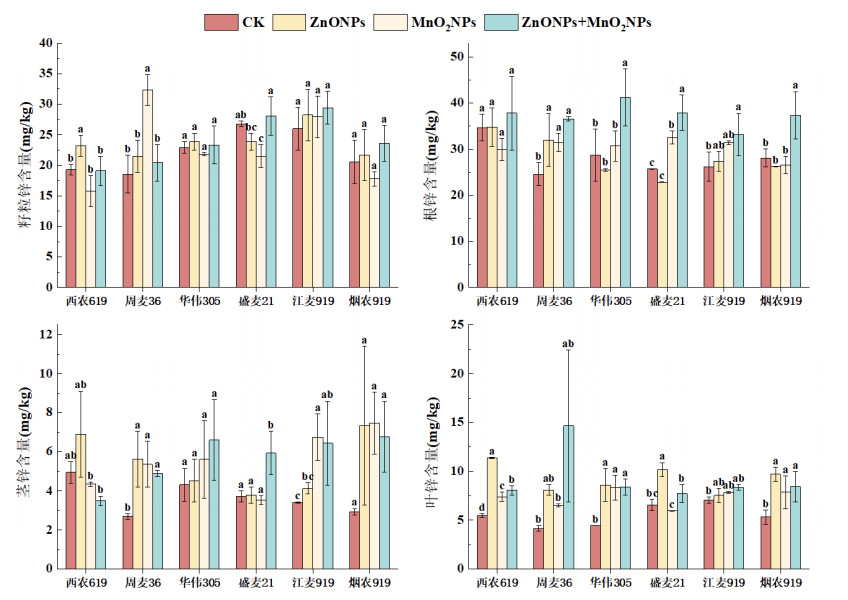 (不同字母表示同一品种在不同叶面处理下在p < 0.05水平的差异显著性) 图 2 叶面喷施纳米材料对6种小麦根、茎、叶、籽粒中Zn含量的影响 Fig. 2 Effects of foliar spraying of nanomaterials on Zn concentrations in roots, stems, leaves and grains of six wheat varieties |