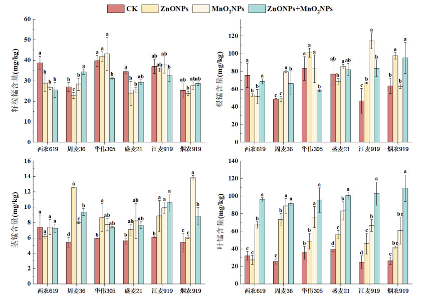 图 3 叶面喷施纳米材料对6种小麦根、茎、叶、籽粒中Mn含量的影响 Fig. 3 Effects of foliar spraying of nanomaterials on Mn concentrations in roots, stems, leaves and grains of six wheat varieties |