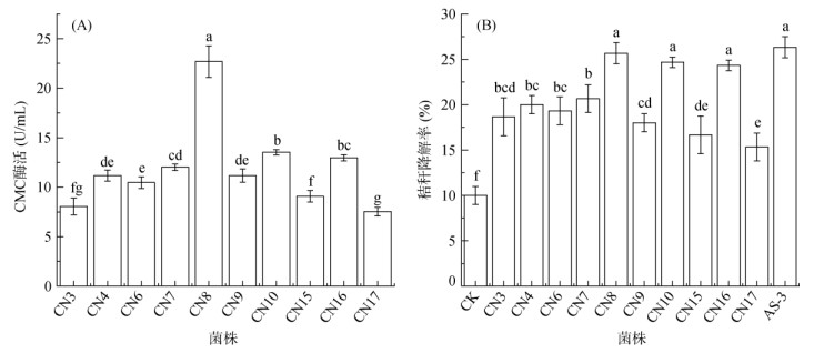 CMC酶活性测定结果显示CN8、CN10、CN16这3株优势菌的酶活性较高且与其他菌株之间存在显著差异(P<0.05),其中CN8的酶活性可达22.70 U/mL (图 2A)。另外,在液体培养条件下,CN8、CN10、CN16的秸秆降解率分别可达25.67%、24.67%、24.33%,秸秆降解率显著高于CK (P<0.05),且与阳性对照菌株之间不存在显著差异(图 2B)。由此可知,CN8、CN10、CN16为耐低温(15 ℃)纤维素降解优势菌。