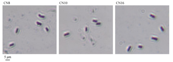 图 3 菌株CN8、CN10、CN16显微镜形态学观察 Fig. 3 Microscopic morphological observations of CN8, CN10 and CN16 strains |