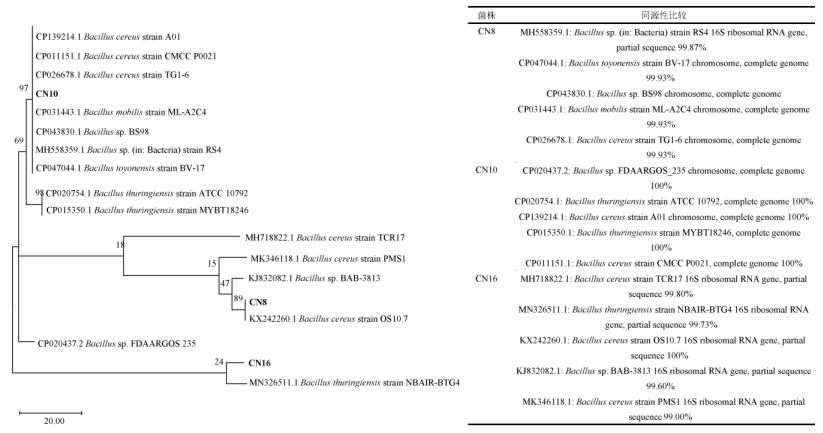 图 4 优势菌CN8、CN10、CN16系统发育树及同源性比对结果 Fig. 4 Phylogenetic tree of dominant bacteria CN8, CN10, CN16 and results of homology comparison |
