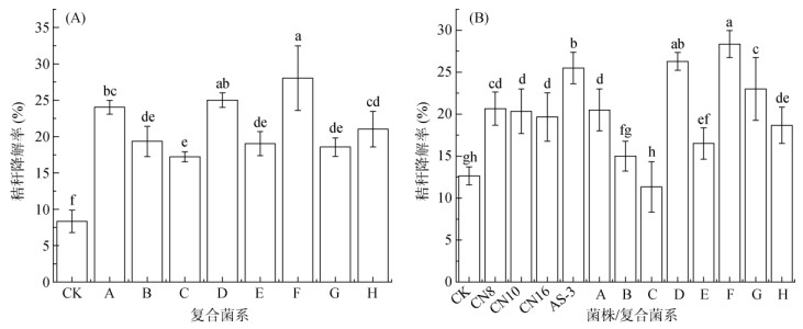 为了筛选耐低温高效降解纤维素复合菌系,对8种组合方式的复合菌系进行液体培养(15 ℃,30 d)下玉米秸秆降解率的测定。由图 5A可以看出,复合菌系的降解率均显著高于CK (P<0.05),其中复合菌系F降解效果最佳,降解率可达28.02%,与CK相比,降解率增幅为236.37%;其次为复合菌系D,对玉米秸秆的降解率达到了26.33%,是CK的3.16倍,并且与复合菌系F之间不存在显著差异。
