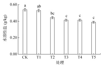 外源添加木本泥炭、腐熟秸秆对土壤表层(0~20 cm)水溶性盐含量具有一定的降低作用(图 1)。各处理水溶性盐含量从小到大为:T5<T4<T3<T2<T1<CK,分别较CK处理降低27.78%、23.15%、23.15%、17.59%、1.85%,除T1处理外,其余各处理与CK处理差异显著(P<0.05)。说明单独添加木本泥炭对土壤盐分抑制效果不明显,腐熟秸秆和木本泥炭一定比例配施可有效降低土壤水溶性盐含量。