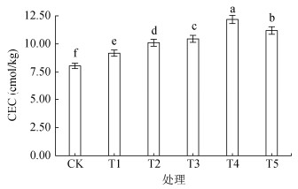 2.2.3 土壤阳离子交换量木本泥炭和腐熟秸秆对盐渍化农田土壤CEC具有显著的提升效果(图 2),各处理CEC从大到小为:T4>T5>T3>T2>T1>CK,分别较于CK处理提升51.32%、38.96%、29.81%、25.57%、14.11%,且各处理间差异显著(P<0.05)。