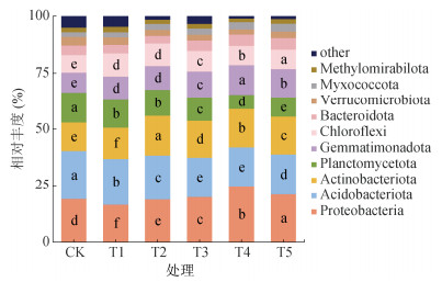 2) 在微生物群落结构方面,各处理细菌群落组成在门水平上未发生显著变化。相对丰度排名前3位的优势菌门随着木本泥炭和腐熟秸秆施用量的增加,变形菌门、放线菌门相对丰度一定程度增加,分别与土壤有机质、全氮含量正显著相关,放线菌门相对丰度还与水溶性盐含量负显著相关;酸杆菌门与之不同,与pH正显著相关,与有机质、CEC负显著相关。整体上,以T4和T5处理微生物群落结构变化较为显著。