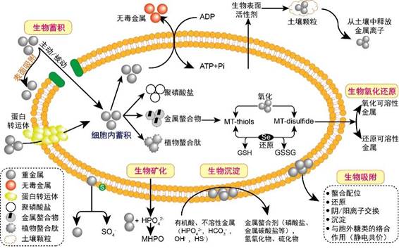 1 微生物修复重金属和多环芳烃污染土壤研究重金属是环境中典型的无机污染物,主要来源于采矿、冶炼、石化、电子工业生产,化肥及农药使用,以及化石燃料燃烧等过程[11],并通过转移和富集被人体吸收,长期接触可能导致器官功能障碍、代谢异常、激素变化、先天性疾病、免疫系统功能障碍和癌症等[12]。土壤重金属污染因其难降解性和持久性,已成为全球环境治理的瓶颈。现有修复技术主要依赖微生物介导的生物地球化学循环过程,通过吸附、生物蓄积、形态转化、生物矿化及沉淀作用等复合机制(图1),调控重金属元素的赋存形态与迁移活性,最终实现其向稳定态或低毒性价态的定向转化[13-14]。微生物细胞表面富含羧基、羟基、氨基等多种化学基团,可通过配位螯合、离子交换和静电吸附等作用实现重金属的胞外固定;其次,微生物分泌的胞外多糖、有机酸和生物酶类等代谢产物,能够通过络合、沉淀等反应将重金属转化为低毒性的硫化物或碳酸盐复合物[15]。微生物除具备胞外屏障功能外,其跨膜转运系统可介导重金属离子内流,并通过金属硫蛋白、多聚磷酸盐等生物分子实现胞内固定,这种多层级防护体系显著降低了重金属的生物有效性和迁移转化能力[16]。值得强调的是,微生物介导的氧化还原反应能够改变重金属价态,而生物矿化作用则可将可溶性金属转化为稳定结晶态,这些协同机制共同构成了微生物修复的核心技术路径。
