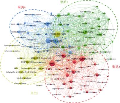图 2 腐植酸在土壤修复研究中的关键词聚类网络图 Fig. 2 Keyword clustering network diagram of researches on the application of humic acid in soil remediation |