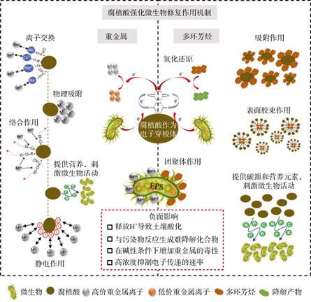 腐植酸是一类存在于土壤、水体、沉积物等环境中的大分子有机物,富含多种官能团(如羧基、酚羟基、醌基、羰基、甲氧基等),具有丰富的结构多样性和独特的化学特性。作为增强微生物修复重金属和多环芳烃的有效刺激手段,腐植酸能通过吸附、络合、离子交换和氧化还原等反应与重金属和多环芳烃相互作用,有效降低其毒性并限制其在环境中的迁移[6];同时,腐植酸可作为表面活性剂,增强多环芳烃的溶解度[7]。其次,腐植酸能作为电子介质加速微生物的呼吸,为微生物提供能源,促进微生物的生长并提高其代谢活性,有效增强重金属的生物还原和多环芳烃的生物降解[8]。尽管大量研究证明了腐植酸在生物修复中的重要性,然而也有研究表明它们对微生物降解具有抑制作用。例如,Mohanmed等[9]发现,在亚热带森林土壤中提取的腐植酸存在条件下,Shewanella oneidensis对Cr(VI)的还原率从65% 显著降低到了56%。Tejeda-Agredano等[10]研究表明,腐植酸对多环芳烃生物降解的影响取决于污染物的存在形式。这些不一致的结果表明,腐植酸对微生物修复过程影响的复杂性,特别是复合污染条件下腐植酸对微生物修复效果及作用机理的复杂性。因此,亟需全面总结梳理腐植酸在调控微生物修复土壤重金属和多环芳烃污染中的作用机制。