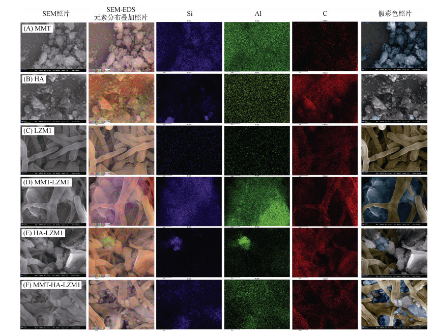(假彩色照片中蓝色区域代表MMT,灰色区域代表HA,黄色区域代表真菌菌丝体) 图 1 蒙脱土对照(A)、胡敏酸对照(B)、微生物处理(C)、蒙脱土-微生物处理(D)、胡敏酸-微生物处理(E)、蒙脱土-胡敏酸-微生物处理(F)的SEM照片、元素分布叠加照片、Si元素分布、Al元素分布、C元素分布以及假彩色照片 Fig. 1 SEM images, superimposed images of element distribution, Si, Al, C element distribution, and false-color images for montmorillonite control (A), humic acid control (B), microbial treatment (C), montmorillonite-microbial treatment (D), humic acid-microbial treatment (E), and montmorillonite-humic acid-microbial treatment (F) |