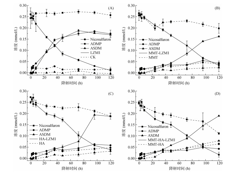 1 材料与方法 1.1 供试材料试验用试剂烟嘧磺隆(> 95%)、2-氨基-4, 6-二甲氧基嘧啶(ADMP,98%)、2-氨基磺酰基-N, N-二甲基烟酰胺(ASDM,95%)、蒙脱土(MMT)购自美国Sigma-Aldrich公司。胡敏酸(HA)购自上海源叶生物科技有限公司。微生物营养基质与底物,包括马铃薯葡萄糖琼脂(PDA)、马铃薯葡萄糖水(PB)培养基,均购自青岛高科技工业园海博生物技术有限公司。磷酸盐缓冲盐水(PBS,pH 7.2 ~ 7.4)购自Biosharp公司。有机溶剂乙腈、乙酸(色谱纯度)购自默克公司。其他涉及的相关化学物质均为化学纯,购自国药集团化学试剂有限公司。微生物降解菌株LZM1(ACCC 32503)购自中国农业微生物菌种保藏管理中心。由实验室Millipore Synergy UV水净化系统(Millipore, Billerica, MA, USA)制备超纯水。