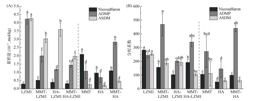 对不同孵育处理体系离心后的沉淀物进行了烟嘧磺隆、ADMP和ASDM的提取与分析测定,发现不同处理沉淀物中的3种物质累积具有显著差异(图 3A)。但5 d后,由于降解体系中不同物质的总浓度不同,可能会导致沉淀物中的累积量不同。因此,引入沉淀–上清液分配系数来描述污染物累积潜能。MMT-LZM1和MMT-HA -LZM1处理中,虽然ADMP在总降解体系(图 2)以及沉淀物(图 3A)中的总浓度和累积量都远小于LZM1处理,但是ADMP的分配系数显著提高(图 3B)。这意味着MMT及MMT-HA可以显著提高ADMP在微生物沉淀的累积,降低ADMP的迁移能力。已有研究表明,ADMP的半致死浓度LD50远大于烟嘧磺隆和ASDM[39],是目前发现的毒性最大的烟嘧磺隆降解产物,并且容易残留,不易进一步发生降解。虽然在含有LZM1的处理中,添加HA、MMT和MMT-HA并没有增加烟嘧磺隆的消减量,但是能够促进具有较强毒性的重要降解产物ADMP在沉淀物中的累积,减少其移动能力,对于缓解微生物降解次生产物的生态毒性具有重要作用与意义。
