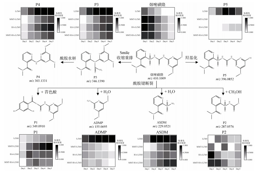 图 4 烟嘧磺隆降解通路和烟嘧磺隆及其降解产物标准化相对浓度热图 Fig. 4 Degradation pathway of nicosulfuron, and heatmap of normalized relative concentrations of nicosulfuron and its degradation products |