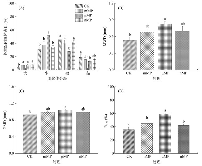2 结果与分析 2.1 PE-MP对土壤团聚体特性的影响培养结束后,PE-MP添加显著改变了土壤团聚体特性(图 3)。如图 3A所示,与CK处理相比,3个PE-MP处理中大团聚体的含量均显著增加,同时小团聚体含量也呈提高趋势,但仅μMP处理与CK处理之间具有显著性差异;与之对应,微团聚体和黏粒的含量均呈下降趋势,但仅μMP处理与CK处理之间具有显著性差异。从各粒级土壤团聚体含量分布的变化结果来看,不同粒径的PE-MP均对土壤水稳性团聚体的形成具有积极作用。进一步计算团聚体MWD、GMD和R0.25指标发现,与CK处理相比,3种粒径PE-MP处理均具有提高团聚体MWD和GMD的作用,但是仅μMP处理提高作用显著(图 3B和图 3C);而3种粒径PE-MP处理均显著提高了团聚体R0.25值,其中以μMP处理更为显著(图 3D)。综合上述结果可以得出,PE-MP暴露对土壤团聚体稳定性的提高具有积极的作用,并且中等粒径水平(微米级)的PE-MP作用效果更加显著。这可能是由于微米级微塑料具有更大的孔体积、比表面积和更丰富的表面官能团(图 1和表 1),使得该粒级PE-MP与土壤胶体物质之间的相互吸附作用更强[3]。