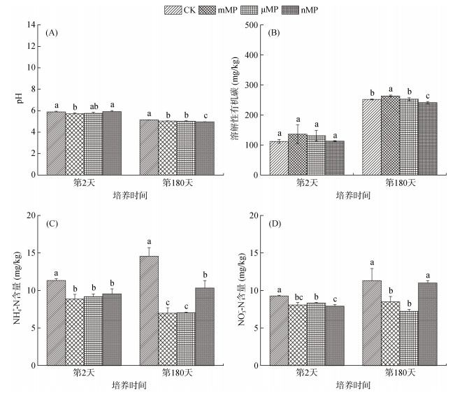 与CK处理相比,所有PE-MP添加处理均显著改变了土壤的pH和DOC、NO3−-N、NH4+-N含量,但变化的方向和程度因PE-MP的粒径不同而表现出明显差异(图 3)。培养初期(第2天)仅mMP处理显著降低了土壤的pH,而其他处理对土壤pH无显著影响;培养结束(第180天)时,3种粒径PE-MP处理均显著降低了土壤pH,并且nMP处理的降低程度最大(图 3A)。对土壤DOC,培养初期,3种粒径PE-MP处理均对DOC含量无显著性影响,而在培养结束时DOC含量在mMP处理中显著提高,在nMP处理中显著降低,在μMP处理中则表现出无显著性变化(图 3B)。造成这一差异的原因可能源于两个方面:一是大粒径MPs可以通过刺激微生物活性增强土壤大分子有机质的分解,从而增加DOC的产生;二是小粒径MP(如nMPs)较大粒径MPs (如mMP)具有更大的比表面积较大,因而具有更强的吸附DOC的能力[3]。另外,3种粒径PE-MP处理均显著降低了培养初期和结束时的NH4+-N含量和培养初期的NO3−-N含量,而mMP和μMP处理显著降低了培养结束时的NO3−-N含量(图 3C、3D)。导致两种无机氮含量降低的潜在原因包括两个方面:首先,PE-MP表面含有的官能团(图 1)与无机氮之间发生吸附络合作用[18];其次,可能是通过上调硝化和反硝化功能基因的表达量,促进了NH4+-N和NO3−-N的转化[19]。
