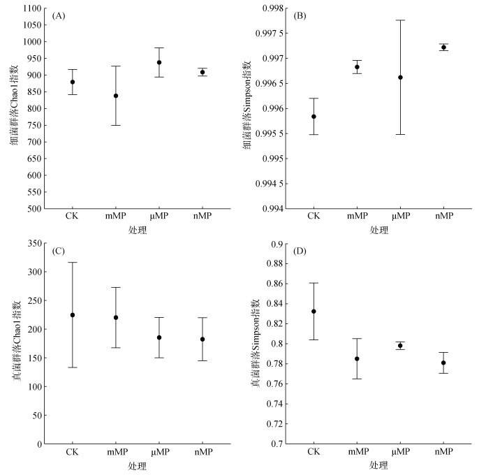 2.3 PE-MP对土壤微生物群落的影响经过180 d培养后,不同粒径PE-MP添加对细菌和真菌群落Alpha多样性指数(Chao1和Simpson指数)的影响如图 4所示。与CK处理相比,细菌群落的Chao1指数值在mMP处理中呈下降趋势,而在μMP和nMP处理中呈上升趋势(图 4A),而Simpson指数值在3个PE-MP处理中均呈上升的趋势(图 4B)。这表明大粒径PE-MP降低了细菌群落的丰富度,而小粒径的PE-MP则提高了细菌群落的丰富度,同时,所有粒径PE-MP添加均增加了细菌群落的多样性。因此,总体上,PE-MP的添加对细菌群落的活性和稳定性具有积极的作用。从真菌群落来看,与CK处理相比,Chao1和Simpson指数在3种粒径PE-MP处理中均有所下降(图 4C和图 4D)。这一结果表明,PE-MP暴露降低了真菌群落的物种丰富度和多样性,对真菌群落的活性和稳定性产生消极的作用,并且PE-MP的粒径越小,作用效果越明显。