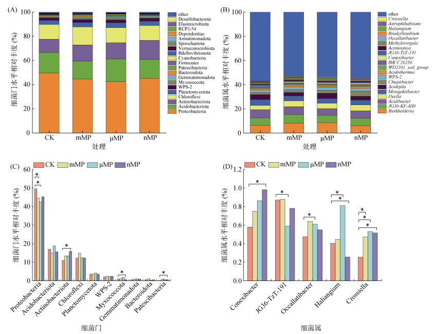 经过180 d培养后,不同粒径PE-MP添加对土壤细菌群落结构的影响如图 5所示。在门水平上,所有处理中的优势菌群均为Proteobacteria(变形菌门)、Acidobacteriota(酸杆菌门)、Actinobacteriota(放线菌门)、Chloroflexi(绿弯菌门)和Planctomycetota(浮霉菌门)(图 5A),但它们的相对丰度在不同处理中表现出明显的差异。与CK处理相比,mMP、μMP处理中的Proteobacteria相对丰度、nMP处理中的Myxococcota(粘细菌门)相对丰度显著下降;而nMP处理中的Actinobacteriota相对丰度显著提高(图 5B)。在属水平上,所有处理中前5位的优势种群依次为Burkholderia、JG30-KF-AS9、Acidibacter、Dyella和Mizugakiibacter(图 5C),但它们在不同处理之间没有显著性差异。相比之下,其他非优势种群的相对丰度变化明显。与CK处理相比,Crossiella的相对丰度在所有PE-MP处理中均显著提高;Haliangium的相对丰度在μMP处理中显著提高,而在nMP处理中显著下降;Occallatibacter的相对丰度在μMP处理中显著提高;Conexibacter的相对丰度在nMP处理中显著增加(图 5D)。