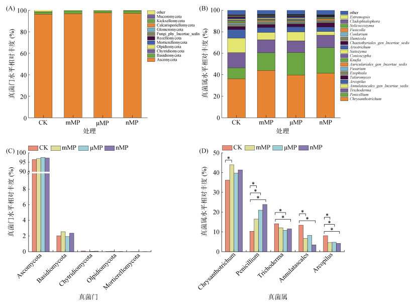 经过180 d培养后,不同粒径PE-MP添加对土壤真菌群落结构的影响如图 6所示。在门水平上,Ascomycota(子囊菌门)在所有处理中占绝对优势,其相对丰度达96.4% ~ 97.5%(图 6A),同时主要真菌菌门的相对丰度在不同处理间没有显著性变化(图 6C)。在真菌属水平上,排名前5位的优势真菌属分别为Chrysanthotrichum、Penicillium、Trichoderma、Annulatascales和Arcopilus(图 6B),这5种真菌均属于Ascomycota门。与CK处理相比,3种粒径PE-MP暴露均显著提高了Penicillium的相对丰度,而显著降低了Arcopilus的相对丰度;mMP暴露显著提高了Chrysanthotrichum的相对丰度,而显著降低了Annulatascales的相对丰度;μMP暴露显著降低了Trichoderma的相对丰度;nMP暴露显著降低了Trichoderma和Annulatascales的相对丰度(图 6D)。上述结果表明,PE-MP添加对微生物群落结构具有显著的影响,并且因粒径水平的不同,产生的影响也具有明显的差异。