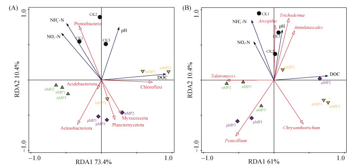 土壤微生物群落结构的变化与土壤化学性质的变化密切相关。由于细菌属水平和真菌门水平中主要物种的相对丰度在各处理之间差异不明显,因此,本文选择在细菌门水平和真菌属水平上进行主要微生物种群与土壤化学性质的RDA分析。RDA结果(图 7A)显示,细菌群落中Proteobacteria的相对丰度与NH4+-N和NO3−-N等无机氮源的含量呈显著正相关。因此,mMP和μMP处理显著降低土壤无机氮含量(图 3C和图 3D)可能是Proteobacteria相对丰度下降的潜在原因。同时,无机氮含量与Myxococcota相对丰度呈显著负相关,而Myxococcota也被证明有利用并消耗无机氮的能力[20]。mMP和μMP处理中较高的Myxococcota相对丰度与其较低的NH4+-N和NO3−-N含量一致。此外,Proteobacteria对pH的变化较为敏感,在酸性条件下不利于其生存[21]。本文的RDA结果也显示,Proteobacteria相对丰度与pH呈显著正相关关系,因此PE-MP添加导致土壤pH酸化程度进一步加剧,这也可能是导致Proteobacteria相对丰度降低的原因之一。此外,RDA结果还显示,Actinobacteriota相对丰度与pH呈显著的负相关关系,nMP处理中土壤pH降低程度最大(图 3A),因而使得其Actinobacteriota的相对丰度提高程度也最大(图 5C)。同时,RDA结果显示,Actinobacteriota的相对丰度与DOC含量之间存在显著负相关关系,表明该种细菌对不稳定碳源具有较强的消耗作用[22],这也可以用来解释为什么nMP处理中的DOC含量显著低于其他处理(图 3B)。另外,真菌群落的RDA分析(图 7B)显示,Annulatascale、Trichoderma和Arcopilus 3个真菌属相对丰度与土壤pH、NH4+-N和NO3−-N含量之间呈显著正相关关系。可见,PE-MP添加对土壤pH和无机氮含量的降低(图 3)是导致这3种真菌种群相对丰度降低的重要原因。相反,Penicillium和Chrysanthotrichum真菌属与pH、NH4+-N及NO3−-N含量之间呈显著负相关关系。