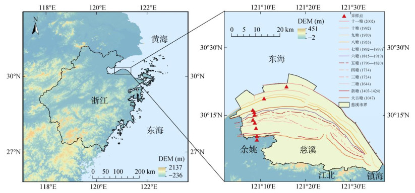 浙江东部慈溪地区沿岸筑堤,堤内开垦造田,耕种水稻等农作物,已有千余年历史,且筑堤造田年代皆有史籍可考,为该地区创建土壤时间序列提供了可靠的依据。长期的围垦耕作、培肥改良已经使该地区的土壤理化属性发生了显著的变化[13],是用作研究土壤碳氮属性演变过程的良好选择。本研究以杭州湾南岸慈溪地区经滩涂围垦培育发展而来的水稻土剖面为研究对象,比较分析碳氮含量、储量在不同围垦时间水稻土剖面中的变化过程,揭示慈溪地区农田水稻土碳氮属性在千年围垦时序内的演化特征,旨在为当地土壤质量管理和农业可持续发展提供理论支撑,并为其他相似地区的土壤管理模式提供科学依据。
