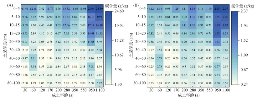 图 2 各剖面土壤有机碳(A)与全氮(B)含量分布变化热力图 Fig. 2 Thermal map of SOC (A) and TN (B) distributions in profiles |