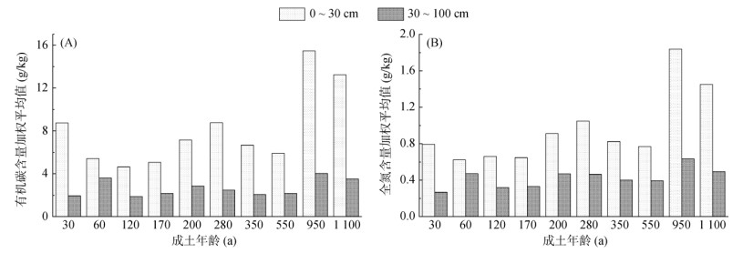 图 3 不同深度范围下有机碳(A)与全氮(B)含量的加权平均值 Fig. 3 Weighted averages of SOC (A) and TN (B) contents at different depth ranges |