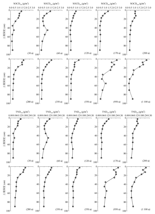 2.3 SOCDicm、TNDicm深度变化函数各剖面中SOCDicm、TNDicm随土层深度的变化特征几乎一致(图 4)。围垦550 a内,大多数剖面中SOCDicm、TNDicm在表层0 ~ 30 cm深度范围内快速降低,30 cm以下则呈现分布均匀且变化平缓的特征。然而,围垦土龄为60 a的剖面较为独特,该剖面的50 cm处SOCDicm、TNDicm均出现一个较大的峰值,推测此处的异常峰值可能是植物根系残留物堆积或是存在腐泥层所致。围垦950 a和1 100 a的两个剖面中30 cm以下SOCDicm、TNDicm仍呈现出随深度增加而降低的趋势,且相比之下降低变化的幅度更大,变化的不平滑性更强烈。根据研究区内各剖面中SOCDicm、TNDicm随深度变化的形态特征,可将其分为指数型、极大值极小值型和湿润锋型3种,其中,围垦土龄为30、120、170、200、280、350和550 a的剖面中的SOCDicm、TNDicm深度函数为指数型,60 a为极大值极小值型,950和1 100 a为湿润锋型。
