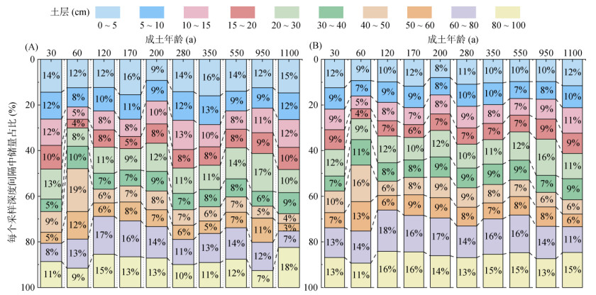 图 5 单位面积1 m土壤中不同采样深度间隔下有机碳(A)与全氮(B)储量占比 Fig. 5 Percentages of SOCs (A) and TNS (B) at different sampling depth intervals in 1 m of soil per unit area |