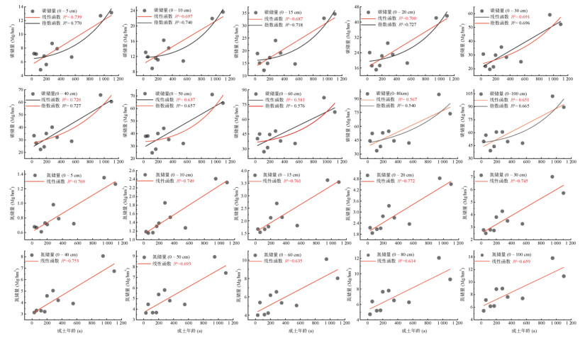 以围垦年限为自变量,不同深度土层中碳氮的储量为因变量作散点图,并对其进行拟合,结果如图 6所示,最佳拟合函数由决定系数R2确定。其中,0 ~ 50 cm土层范围内碳储量的最佳拟合函数均为指数函数,表明在该深度范围内,有机碳在围垦前期累积速度较慢,在围垦后期累积速率较快;0 ~ 60 cm和0 ~ 80 cm土层范围内碳储量的最佳拟合函数为线性函数,表明在这一范围内,有机碳在各个时段内的累计速率较为均匀,持续增加;在1 m深的剖面中,碳储量的最佳拟合函数又从线性函数转变为指数函数。氮储量在各个深度范围内均以线性函数为最佳拟合函数,表明在各土层深度范围内,全氮的累积速率相比有机碳更加平稳。