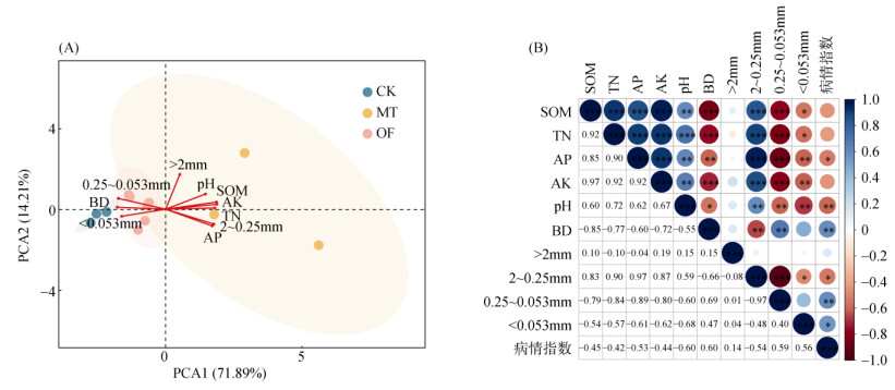 (图中*、**、***表示相关性达 P<0.05、P<0.01 和 P<0.001 显著水平) 图 1 基于土壤理化性质的PCA分析(A)和土壤理化性质与病情指数的相关性分析(B) Fig. 1 PCA analysis based on soil physicochemical properties(A)and correlation analysis between soil physicochemical properties and disease index (B) |