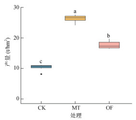 2.2 生姜产量生姜产量如图 2所示,与CK处理相比,施用有机物料处理(MT、OF)能显著提升生姜产量。其中MT处理的增产效果优于OF处理,与CK相比,MT处理的生姜产量显著提高了155.0%,而OF处理产量增加了71.9%;MT处理相比OF处理增产48.3%。
