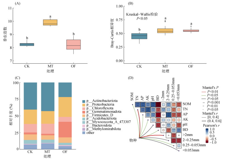 与CK处理相比,MT处理显著提高了土壤细菌群落的α、β多样性,这表明天然腐殖质材料增加了土壤细菌的物种丰富度且显著改变了土壤细菌群落组成;OF处理对土壤细菌群落α多样性无显著影响,显著提高了土壤β多样性(图 3A、3B)。各处理细菌门水平相对丰度如图 3C所示,其中丰度最高的5种菌分别为:放线菌门(Actinobacteriota)、变形菌门(Proteobacteria)、绿弯菌门(Chloroflexota)、芽单胞菌门(Gemmatimonadata)、厚壁菌门(Fimicutes_D),共占细菌总丰度的87.7%~90.6%。