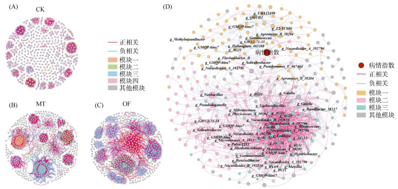 图 4 细菌共现网络(CK (A),MT(B),OF (C))以及细菌与病情指数网络(D) Fig. 4 Bacterial co-occurrence networks(CK (A)), MT(B), OF (C)) and network diagram of bacterial co-occurrence with disease indices(D) |