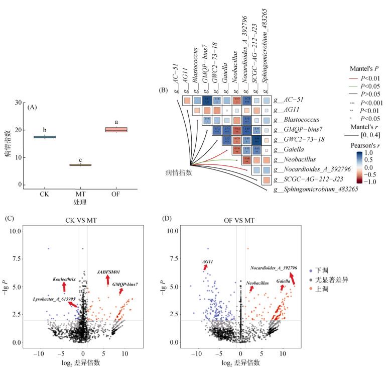 图 5 不同处理对生姜青枯病病情指数的影响(A),细菌属水平群落相关性及对生姜青枯病的影响(B),CK和MT处理间微生物差异分析(C)以及OF和MT处理间微生物差异分析(D) Fig. 5 Disease index of ginger bacterial wilt under different treatments(A), correlation at bacterial genus level and its impact on ginger bacterial wilt(B), and microbial differences between CK and MT(C) and between OF and MT(D) |