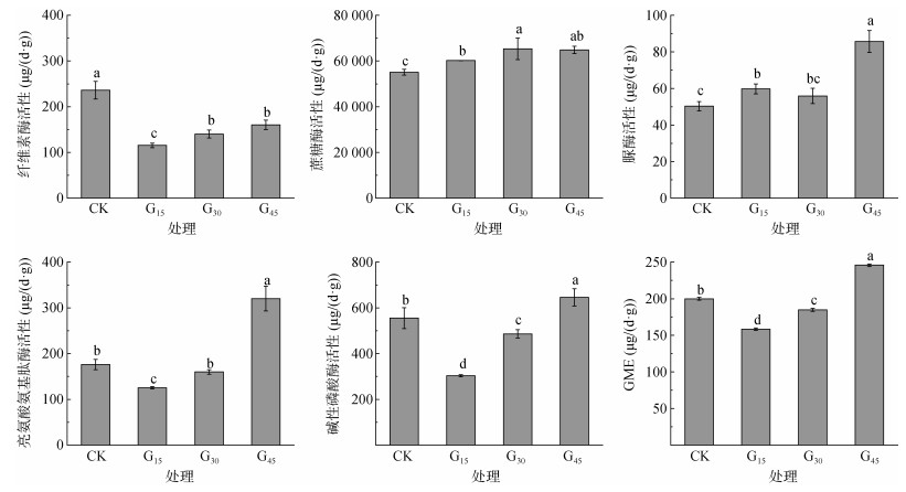 土壤酶活性综合指数(GME)计算表明,CK处理为199.95 μg/(d·g),G15处理为158.38 μg/(d·g),G30处理为184.79 μg/(d·g),G45处理为245.86 μg/(d·g),G45>CK>G30>G15(图 1)。因此,添加45 t/hm2磷石膏的苏打盐碱稻田耕层土壤综合酶活性最高。