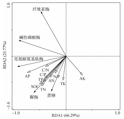 1.4 测定项目与方法土壤有机碳(SOC)采用外加热–重铬酸钾滴定法测定,全氮(TN)采用硫酸–催化剂消解–连续流动分析仪法测定,全磷(TP)采用硝酸–高氯酸消解–连续流动分析仪法测定,全钾(TK)采用三酸消解–电感耦合等离子体原子发射光谱法测定,碱解氮(AN)采用碱解扩散法测定,有效磷(AP)采用NaHCO3浸提法–连续流动分析仪法测定,速效钾(AK)采用乙酸铵浸提–电感耦合等离子体原子发射光谱法测定,具体方法参照鲍士[15]旦编著的《土壤农化分析》第3版。C/N、C/P和N/P均采用质量比,即C/N为SOC含量/TN含量,C/P为SOC含量/TP含量,N/P为TN含量/TP含量。