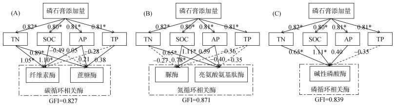 基于RDA结果,筛选对土壤酶活性具有较大影响的TN、SOC、AP和TP进行PLS路径分析,得到土壤肥力对酶活性的直接效应(图 3),其中对与碳、氮、磷循环相关酶活性的拟合优度指数(GFI)分别为0.827、0.871和0.839,说明模型适配良好。PLS模型表明,磷石膏添加量对TN、SOC、AP和TP的影响体现为显著正效应,路径系数分别为0.82、0.80、0.81和0.81。TN含量对纤维素酶和蔗糖酶活性的影响体现为显著正效应,路径系数分别为1.05和0.89;SOC含量对纤维素酶活性的影响体现为显著正效应,路径系数为1.10(图 3A)。TN含量对亮氨酸氨基肽酶活性的影响体现为显著正效应,路径系数为0.65;SOC含量对脲酶和亮氨酸氨基肽酶活性的影响体现为显著正效应,路径系数分别为0.78和1.11(图 3B)。TN和SOC含量对碱性磷酸酶活性的影响体现为显著正效应,路径系数分别为0.65和1.11(图 3C)。以上结果说明,磷石膏不同添加量会通过改变TN和SOC含量间接影响纤维素酶、亮氨酸氨基肽酶和碱性磷酸酶活性,通过改变TN含量间接影响蔗糖酶和脲酶活性。