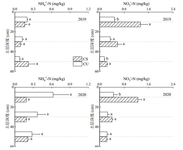 CU和CS处理下不同土层的NO3--N和NH4+-N含量见图 1。对于NO3--N,与CU处理相比,CS处理显著提高了2019年和2020年表层土壤NO3--N含量;在20 ~ 40 cm土层,与CU处理相比,CS处理提高了这两年土壤NO3--N含量,但差异不显著;在40 ~ 60 cm土层,年际间两处理NO3--N含量变化趋势不同。对于NH4+-N,在0 ~ 20和20 ~ 40 cm土层,与CU处理相比,CS处理降低了2019年和2020年土壤NH4+-N含量;在40 ~ 60 cm土层,两处理NH4+-N含量变化趋势不同。