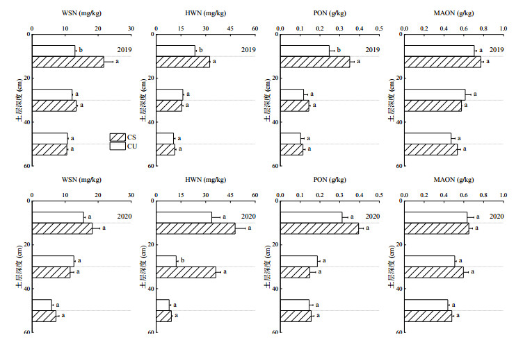 CU和CS处理不同土层的WSN和HWN、PON和MAON含量见图 2。对于WSN,与CU处理相比,CS处理提高了2019年和2020年表层土壤WSN含量,且在2019年差异达到显著水平;两处理底层土壤WSN含量差异不显著。各土层土壤HWN的变化趋势与WSN基本一致,与CU处理相比,CS处理提高了2019年和2020年表层土壤HWN含量,且在2019年差异达到显著水平;除2020年20 ~ 40 cm土层外,两处理底层土壤HWN含量差异不显著。对于PON,与CU处理相比,CS处理2019年表层土壤PON含量显著提高41.9%,2020年表层土壤PON含量提高26.6%,但差异未达显著水平,两处理底层土壤PON含量差异不显著。对于MAON,各土层两处理间差异均不显著。结果表明,长期覆膜秸秆还田能够提高表层土壤WSN和HWN及PON含量。