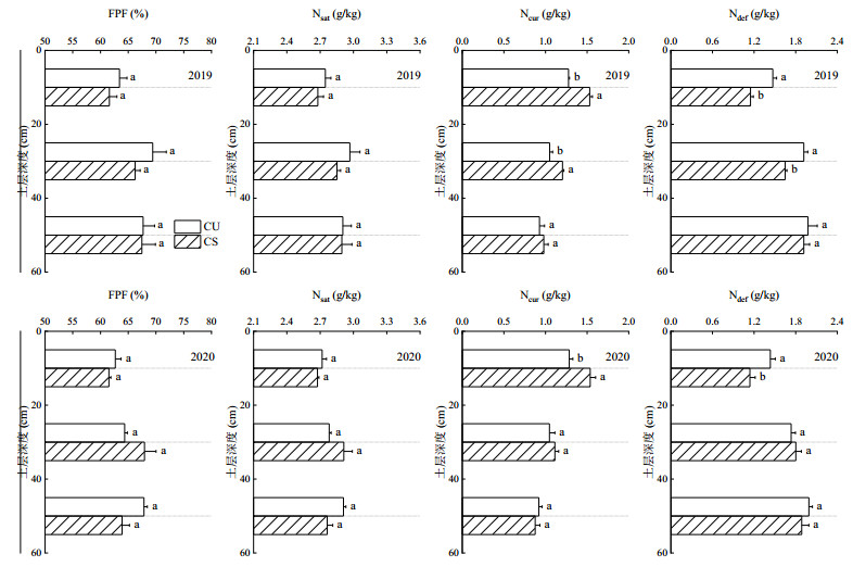 长期覆膜秸秆还田对不同土层FPF、Nsat、Ncur和Ndef的影响见图 3。对于FPF和Nsat,两处理在各土层均无显著差异。对于Ncur,在0 ~ 20 cm土层,与CU处理相比,CS处理显著提高了两年的Ncur;在20 ~ 40 cm土层,CS处理仅在2019年显著提高了Ncur;在40 ~ 60 cm土层,两处理的Ncur无显著差异。对于Ndef,在0 ~ 20 cm土层,与CU处理相比,CS处理显著降低了两年的Ndef;在20 ~ 40 cm土层,CS处理仅在2019年显著降低了Ndef;在40 ~ 60 cm土层,两处理的Ndef无显著差异。可见,长期覆膜秸秆还田能够显著提高表层土壤的Ncur和显著降低表层土壤的Ndef。