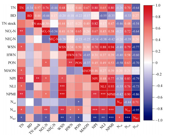 (*、**、***分别表示在P < 0.05、P < 0.01、P < 0.01水平显著相关) 图 4 CU和CS处理表层土壤全氮及氮组分与氮库管理指数和氮饱和亏缺的相关矩阵图 |