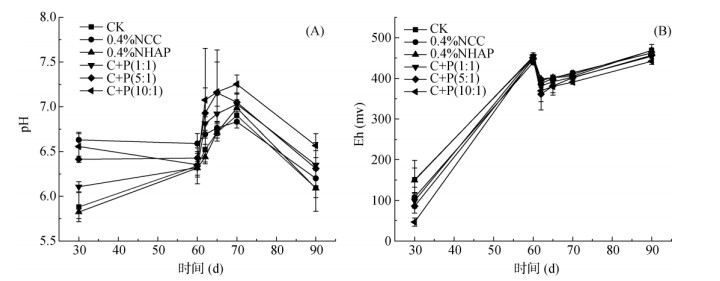 图 1 土壤溶液pH(A)、Eh(B)的动态变化 Fig. 1 Dynamics of soil solution pH (A), Eh(B) |