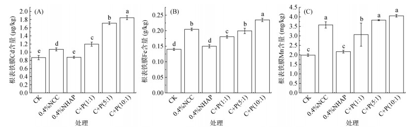水稻根表铁膜中元素含量变化如图 3所示。根表铁膜中Cd元素含量范围在0.87 ~ 1.85 μg/kg,与CK组相比,除0.4%NHAP处理,其他处理组均能显著提高根表铁膜Cd含量,其中C+P(10∶1)处理提高量最大,相较于CK组显著提高了53.1%(P < 0.05)。根表铁膜中Fe元素含量范围在0.14 ~ 0.24 g/kg,与CK组相比,除0.4%NHAP处理,其他处理组均能显著提高根表铁膜Fe含量,其中C+P(10∶1)处理提高量最大,相较于CK组显著提高了40.3%。根表铁膜中Mn元素含量范围在1.99 ~ 4.33 mg/kg,与CK组相比,除0.4%NHAP处理,其他处理均能显著提高根表铁膜Mn含量,其中0.4%NCC、C+P(5∶1)和C+P(10∶1) 3个处理提高量较大,相较于CK组显著提高了44.4%、48.1% 和51.0%(P < 0.05)。